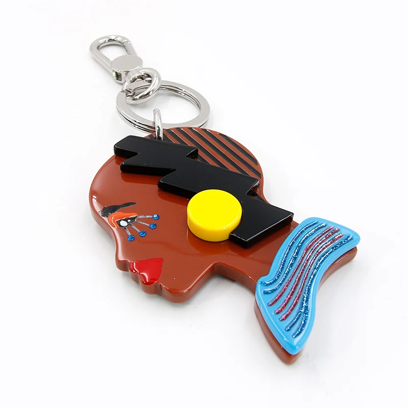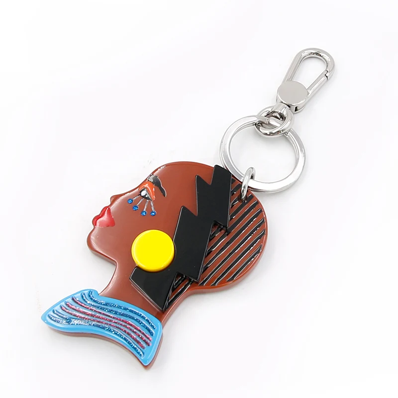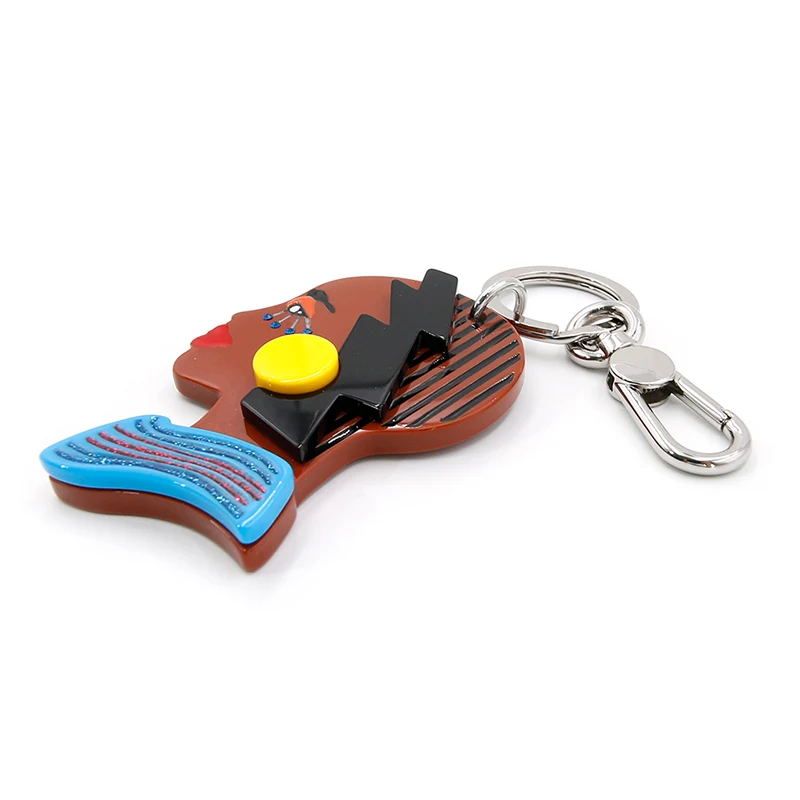 Tá craiceann donn ag an duine sa phortráid keychain mar dhúchas na hAfraice, tá liopa dearg ag teacht leis an súile dearg, a mheaitseálann collar gorm na fabhraí ghorm, agus tá earring buí geal dotáilte in aice leis an ghruaig dhubh.